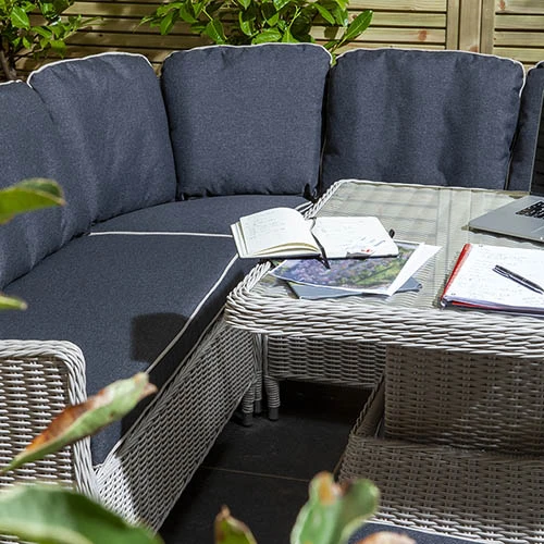 Welcome to a world of contemporary casual dining with this stunning corner dining/entertaining set which comfortably sits six people. Coming with the added benefit of having seat and back cushions and a height adjustable table, this is a perfect set for whiling away the hours with family or friends alike.